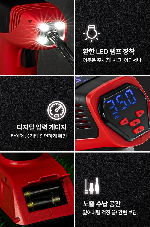 LED 램프 및 디지털 압력 게이지 - 야간에도 환한 LED 램프가 장착되어 있어 어두운 주차장에서도 사용이 용이합니다. 또한 디지털 압력 게이지를 통해 사용자는 공기압을 간편하게 확인할 수 있습니다.