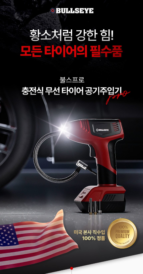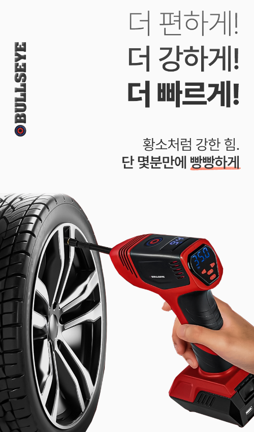 불스프로는 충전식 무선 타이어 공기주입기로, 언제 어디서든 쉽게 사용할 수 있습니다. 누구나 손쉽게 타이어 공기압을 채울 수 있으며, 거대한 카센터용 콤프레셔를 무선으로 휴대할 수 있는 크기로 만들었습니다.