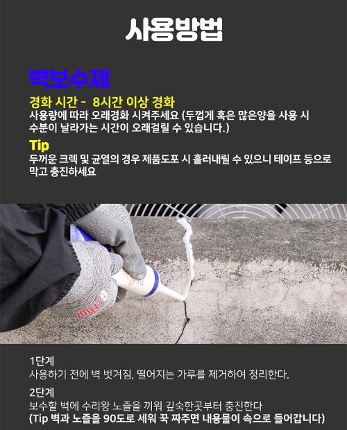 제품의 사용법은 매우 간단하며, 누구나 쉽게 따라 할 수 있습니다. 이는 DIY 보수 작업을 처음 접하는 사용자도 전문가처럼 수리 작업을 완성할 수 있게 해줍니다.