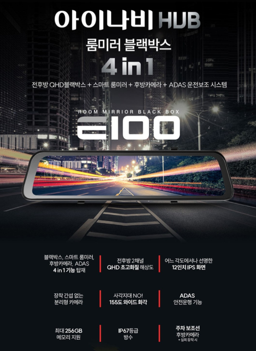 아이나비 HUB E100 룸미러 블랙박스 32GB 전후방 QHD 초고화질 2채널 / 장착 간섭 없는 분리형 카메라